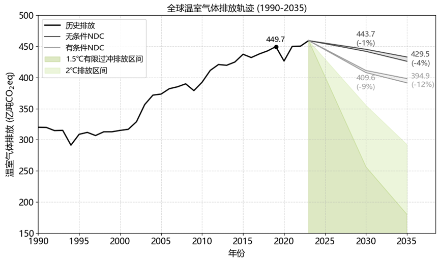 全球气候行动的雄心不足,承诺与目标严重脱节。目前,仅覆盖全球56%排放的48个国家更新了减排承诺。模型测算显示,即便这些承诺全部兑现,到2035年全球碳排放也仅比2019年减少4%-13%,远未达到政府间气候变化专门委员会(IPCC)提出的2℃温控目标所要求的35%减排量。此外,多数国家的中短期行动与长期“碳中和”愿景相去甚远,令其气候承诺的可信度大打折扣。